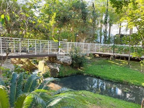 Bosque com passarela em meio à natureza com pássaros e córrego